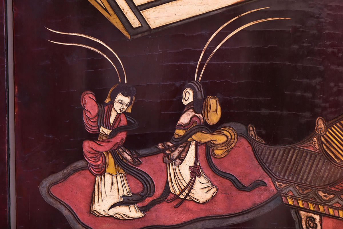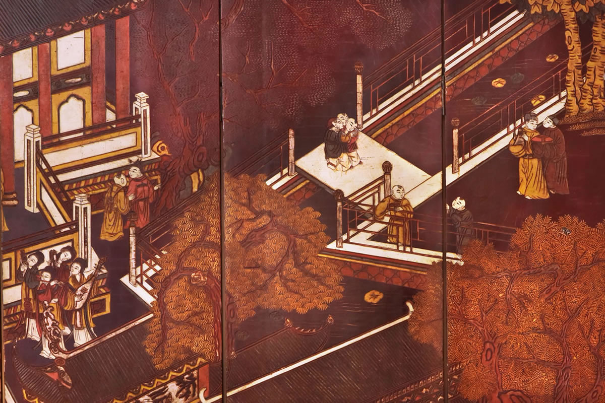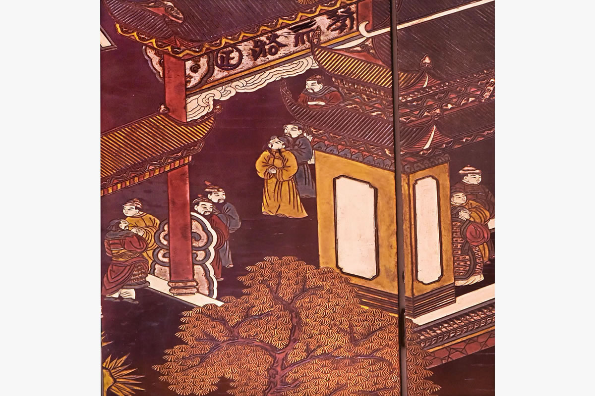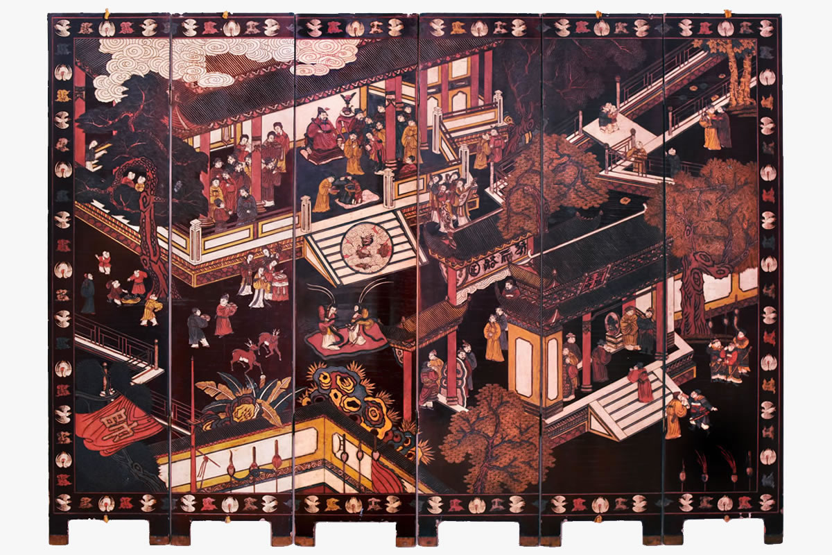 Biombo dobrável com 6 painéis; madeira esculpida laqueada preta.
