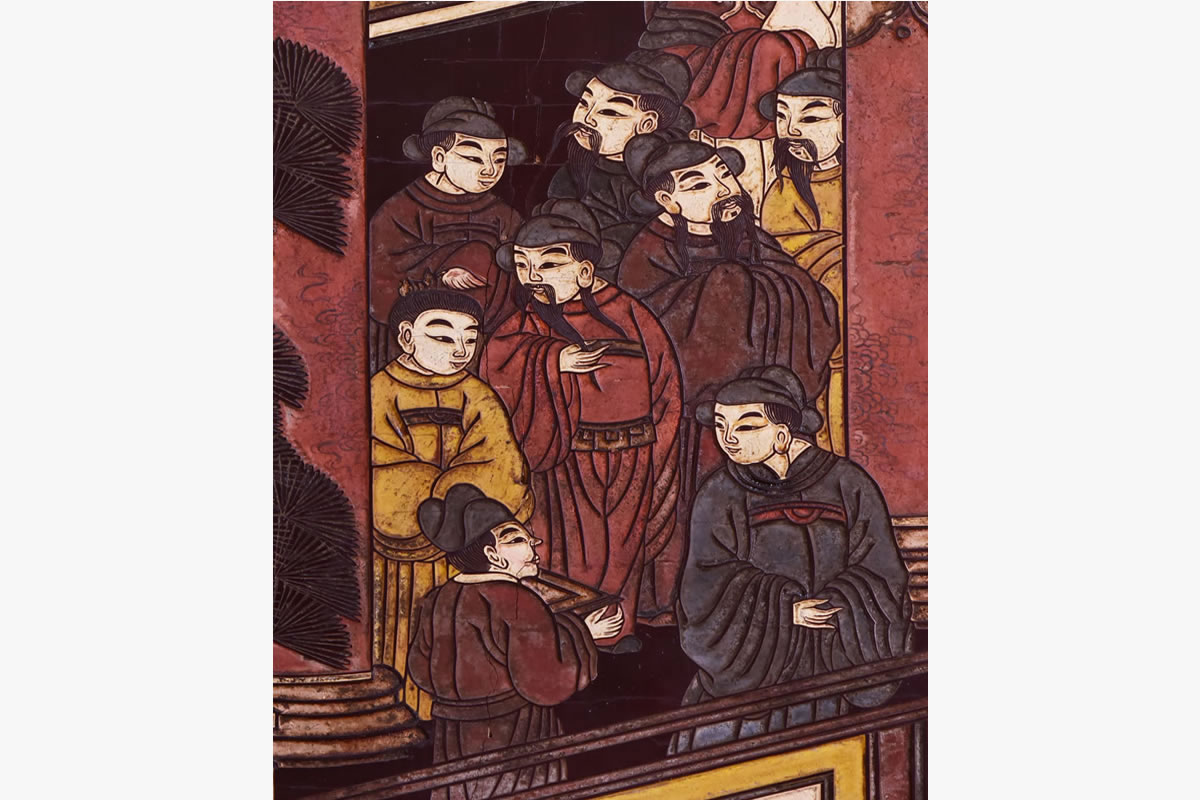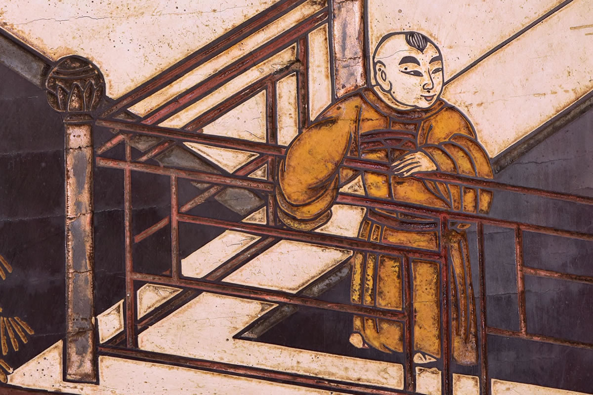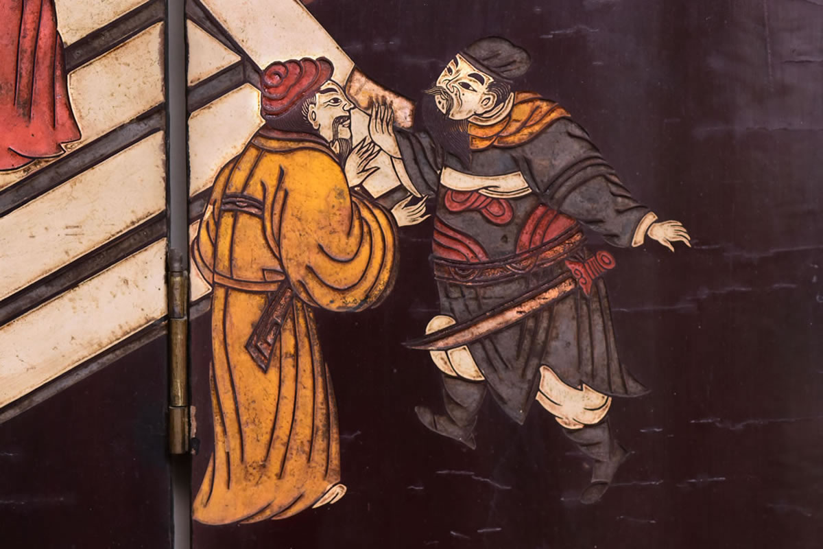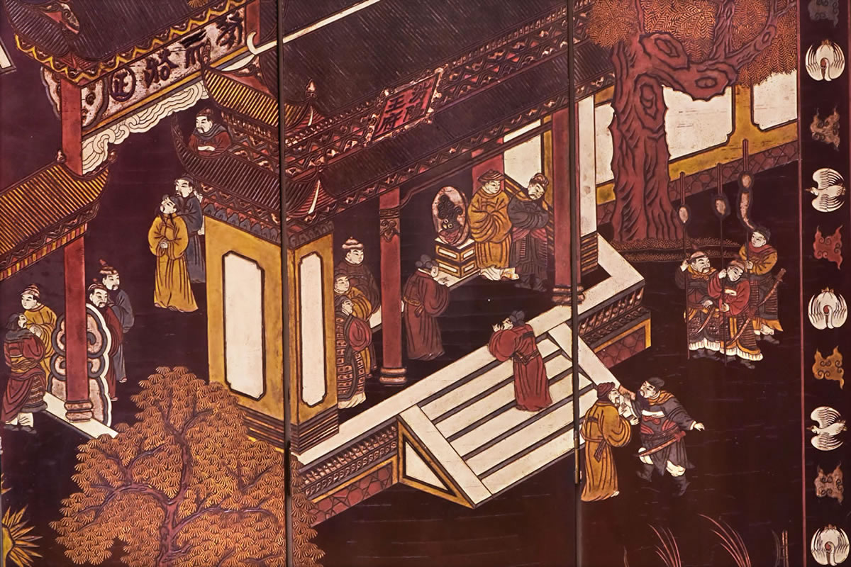 Biombo dobrável com 6 painéis; madeira esculpida laqueada preta.