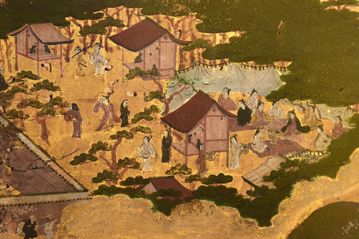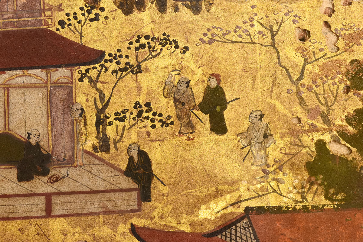 Nanquim, aquarela e ouro em seda ou papel preparado, sem colofão, invólucro de brocado verde e dourado, extremidades de rolagem em esmalte cloisonné colorido.